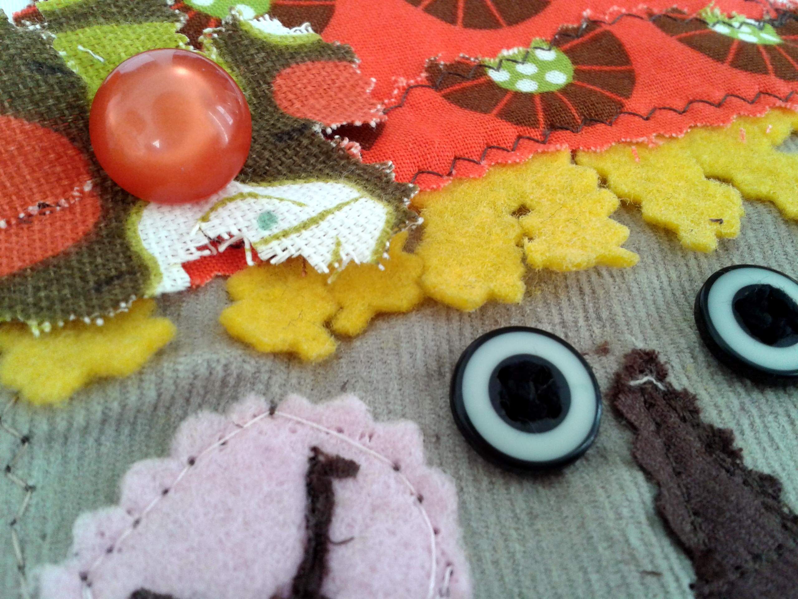 The fun part of the shirt applique for me is in the details. It was tough to choose the right buttons for the eyes, but I think these black ones with a white border strike the right chord. And the straw hair (yellow felt) is too cute–it turned out great cut with pinking shears and left to flap loosely. And the little hat has a floppy flower detail (done in the apple fabric) with an orange button for the center. I love fun little details like that!
