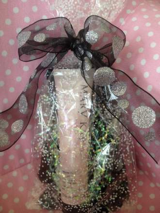 When I originally talked with her about getting a personal makeup refresher, I had asked if she might be willing to donate a giveaway if I ended up blogging it, and she said YES! [That’s kind of a super-neat perk of being a blogger, I think: I can ask people to offer up something for a giveaway, and they say yes!] She even wrapped it in this cute little bag & bow and included a pair of black knit gloves–perfect to tuck into your coat pockets and pull out when a chilly fall afternoon hits!