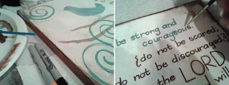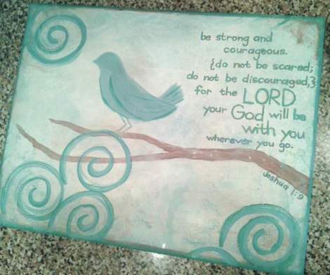 THIS is where I wish I’d taken more photos along the way… because first I painted a birdie on the branch with a white background… then I added this verse in large print that took up most of the right half of this canvas… Then I painted back over that with white… Then I added the verse back in small print in orange… Then went over the orange with black sharpie… Then went over the black with blue… Then added swirls with a black sharpie… Then went roughly over them with blue… Then the lighter blue too… Then added white & blue paint mixed together and watered down all over the canvas and blotted it back off to give the painting a more aged & mottled effect… I painted the four sides of the canvas brown… Then outlined the border of the front with black sharpie… Then went over all that with blue… And then I wondered if salt does the same thing with acrylic paints that it does with watercolors, so I tossed some of that on there in a few spots, too… [I think that about covers it, though I can’t vouch for the exact order.]