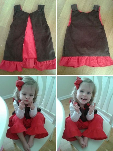 And with even the narrow amount of fabric from my brown and red microcord end bolts, I am able to cut my pattern pieces for a cute jumper and pants for Sissy.