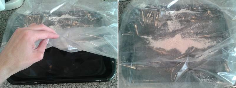 I don’t have a fancy turkey pan, so I just use the biggest pan I have or my largest casserole dish. I add 1 tbsp flour to the oven bag and shake it around (to prevent the bag bursting during cooking). And I lay my bag across my pan ready for my turkey to jump right in. Go ahead and remove the center oven rack and preheat the oven to 350 degrees.
