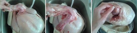 Now for the grody part: remove the neck and giblets and gravy packet and whatever other stuff they’ve crammed into this poor bird’s orifices. Check both ends. Wash the turkey with cool running water (inside and out) until the water runs clear. [Ew. But worth it.]