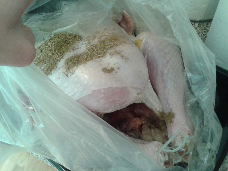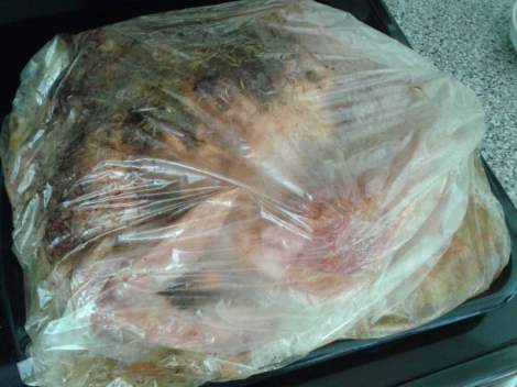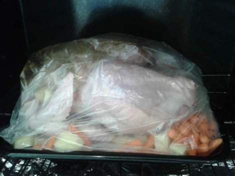 Then finagle your clean bird into the oven bag (flex those muscles!). [It doesn’t matter which way it’s facing, as long as it’s breast side up.]