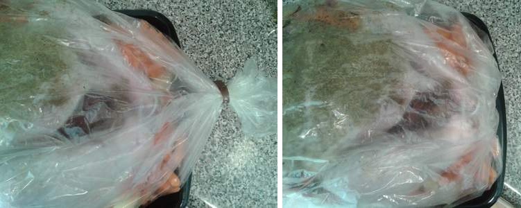 Then seal the bag according to the oven bags packaging directions (basically loosely fasten the zip-tie). Then tuck in the overhang into the pan and cut a few small slits in the top of the bag for ventilation.