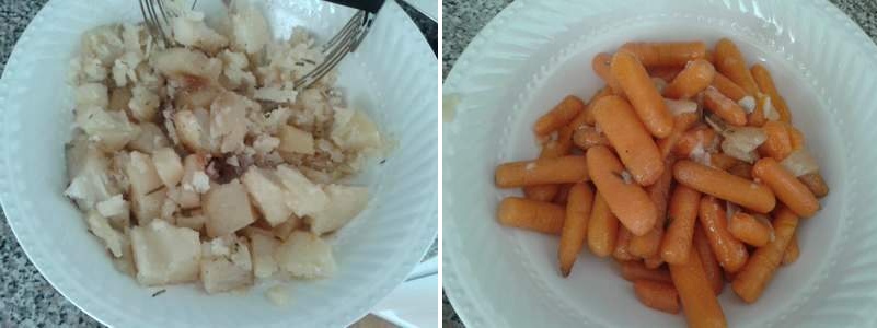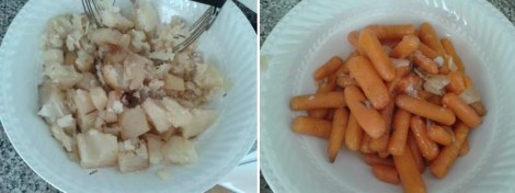 Scoop out the potatoes and carrots into two bowls. The potatoes can be left as they are or they can be mashed. Yummo.