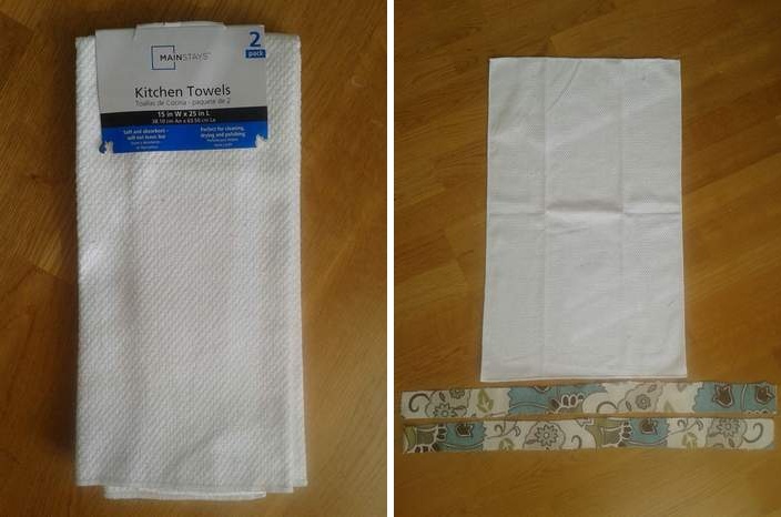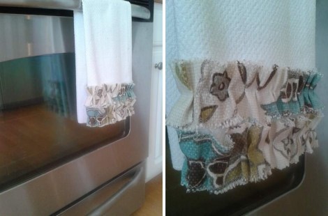 I used one of the leftover towels from the last time I made a [more taylored] towel for the kitchen, and I cut the fabric strips about twice the width of the open towel.