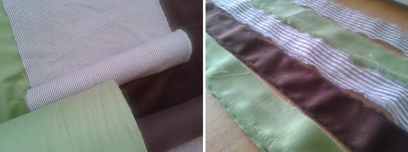So I grabbed some fall/Thanksgivingsy brown and green microcords and green strip seersucker. For these, I just tore the strips (fast & very therapeutic: just start each strip with a scissors snip, then tear a perfectly straight line every time!).