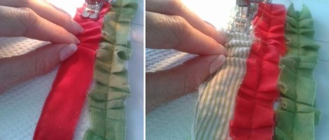 Then just scrunch up some of the fabric a few inches at a time and sew it down, and repeat the length of the strip (if there is extra fabric strip, just cut it off). Then add another rrrrrrrow of rrrrrrruflles (I like to rrrrrrrrrroll my rrrrrrrrrrrrrr’s). π