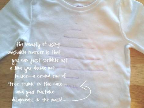 Using a washable marker, draw graduated lines in a Christmas tree shape on the front of a blank shirt (I love the cheap Garanamals ones from WalMart. At under $4 each, they are very affordable, and with great details like the lettuce edge at the sleeves and hem, I love them).