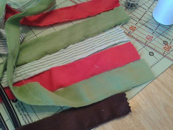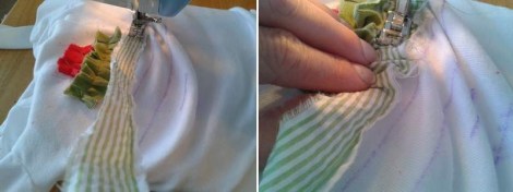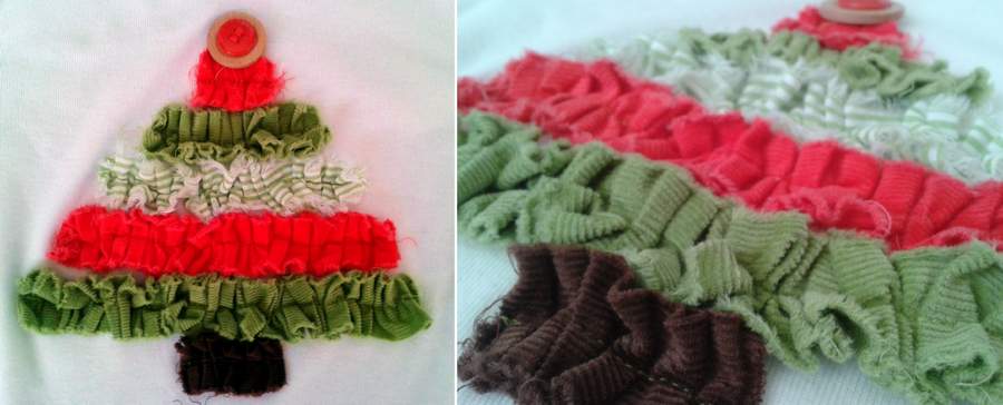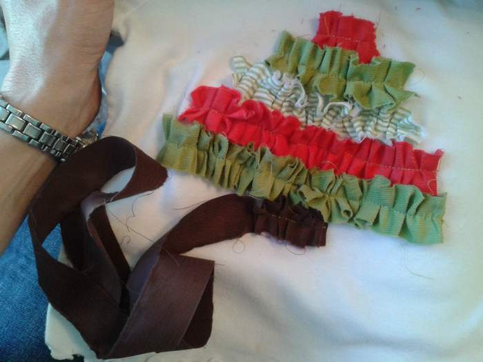 So I grabbed a few of those extra red and green strips from when we made the ruffle towels and did almost the exact same steps as when we made the pink & green ruffled shirt… but just turned everything on its side.