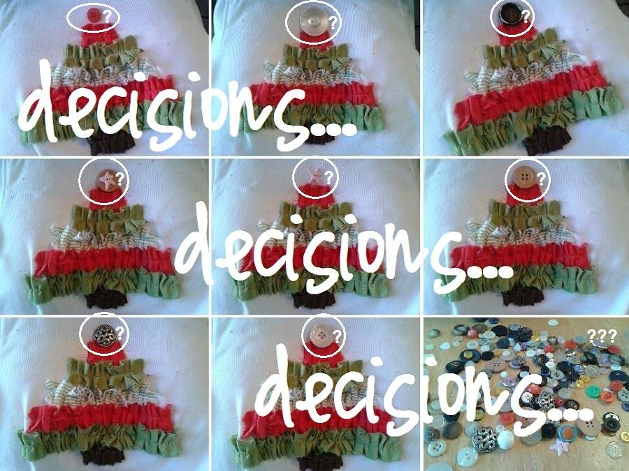 Add a button (oh, a star-shaped button could be lovely!) to the top of the tree to finish. [I went with a small red stacked on top of a natural wood button.] Sew your button(s) on, and you’re off to the races! [You could even add more buttons as ornaments if you wanted.]
