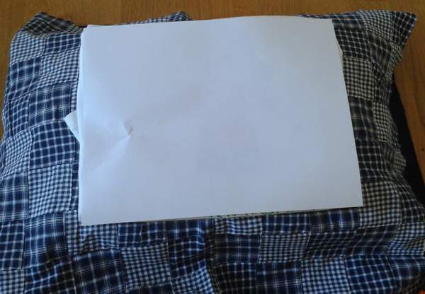 To do some real technical measuring (that’s a joke), I draped the pillow cover piece of fabric and the t-shirt over the pillow form to get an idea of what size I wanted the window.