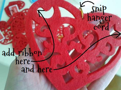 I just snipped the ornament hanger and tied a row of hearts together with alternating pinks, red, and white ribbon.