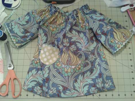 tunic completed on cutting board Published September 19, 2013 at 470 × 352 in Polka Dot Pocket, Ric-rac Trim, And Ruffles {adding fun to a girl’s tunic} Next →
