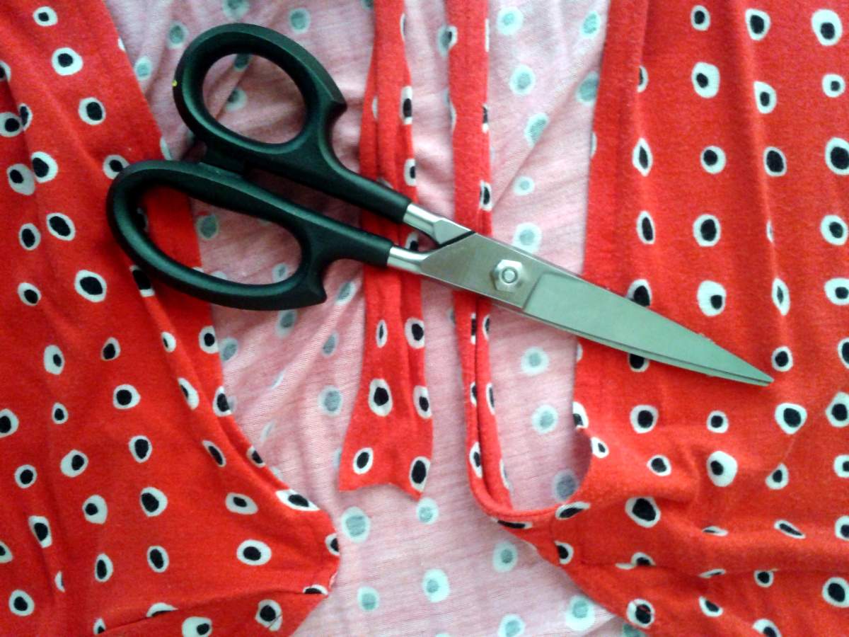 wrap dress to cardi upcycle 02 cut straps Published January 15, 2014 at 2560 × 1920 in Red to Ruffles: Simple Upcycled Wrap Dress To Cardi ← Previous Next →