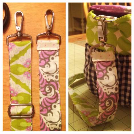 I made a super simple two-sided strap with a couple of long, skinny Heather Bailey fabric scraps and attached them to the hardware.