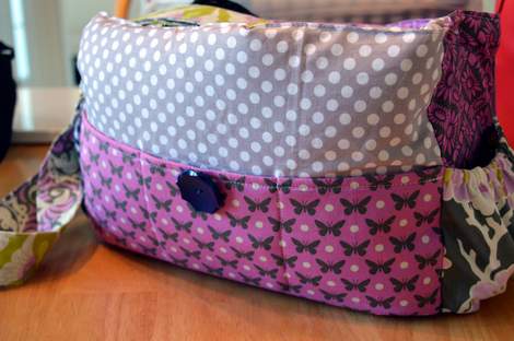 [Here is a close up of the front pockets… and the big button I later added for the flap top closure.]