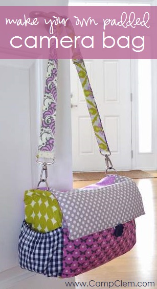 So I decided to make myself a new camera bag. I grabbed some fabrics from my stash, mostly lovely Heather Bailey fabrics with a bit of navy gingham and grey polka dot thrown in, some bag hardware (which I cut off my hubs’ worn ragged old gym bag when he threw it out like a year ago), and a 1/3 yard x about 80″ sheet of 1/4″ padding/foam ($2/foot at the fabric shop upholstery section). [So basically, this bag only cost me $2 total to make. WINNING.]