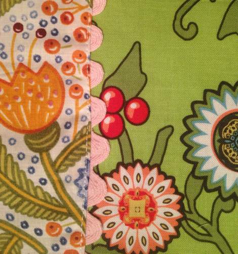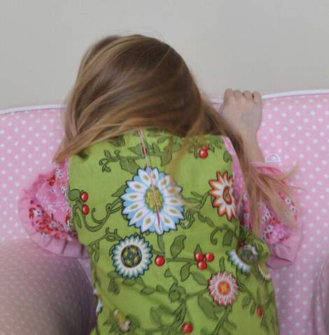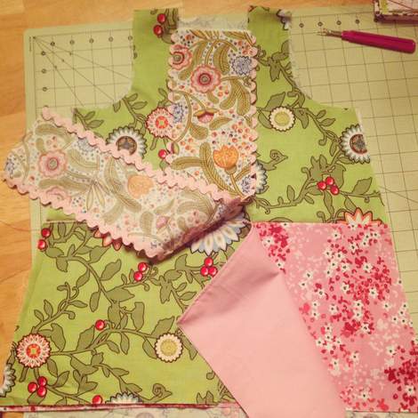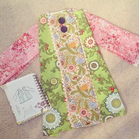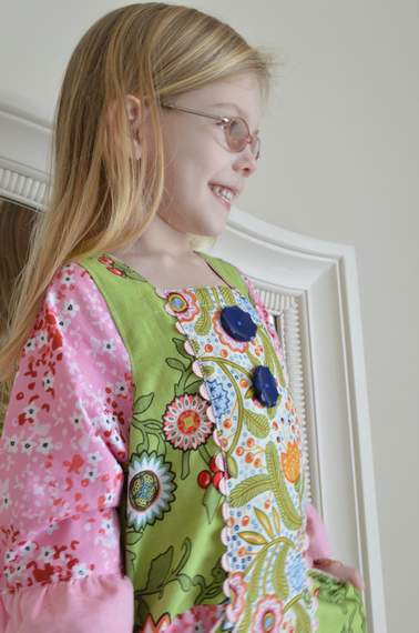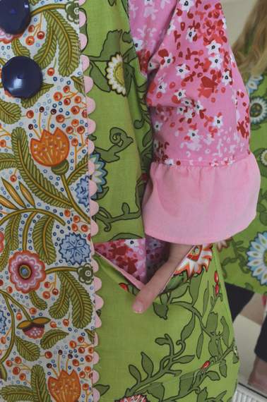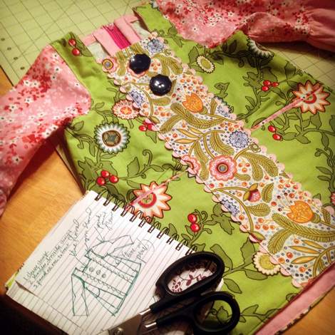 This dress sort of has its roots in a humble A-line dress… But I cut the front in half across the middle to “line” the pockets. The bottom half of the green dress front had pale pink microcord added to it, and the top half had the contrasting sleeve fabric added, so when it is put back together as a simple dress, it has nearly-invisible slip pockets lined with a fun surprise. Then I added the center strip top-stitched to the front to divide the “pockets.” [The bottoms of the pockets were created when I hemmed the dress, and the sides when I sewed the front piece of the the dress to the back.]